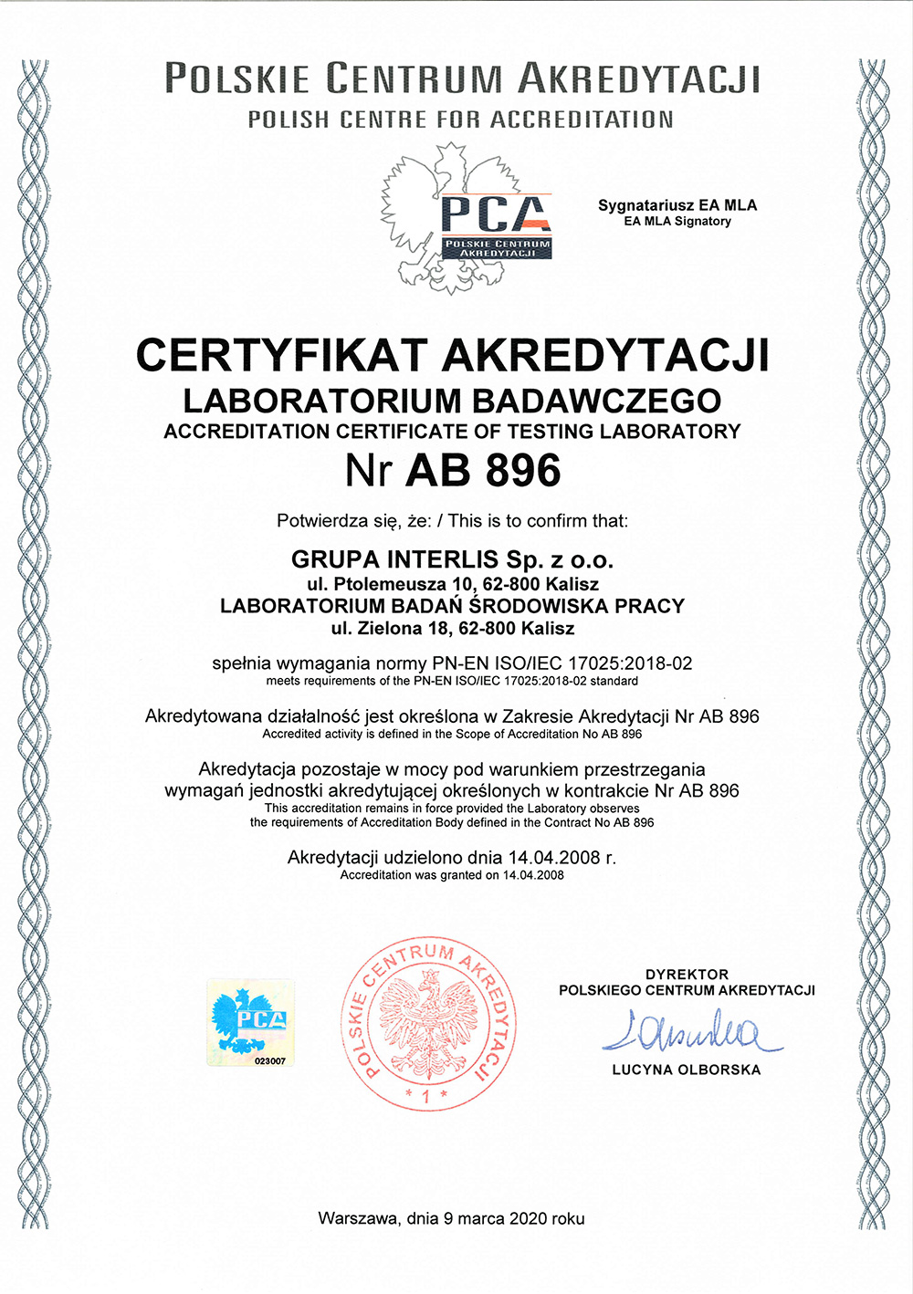 AB 896 wg PN-EN ISO/IEC 17025:2018-02, wydany przez Polskie Centrum